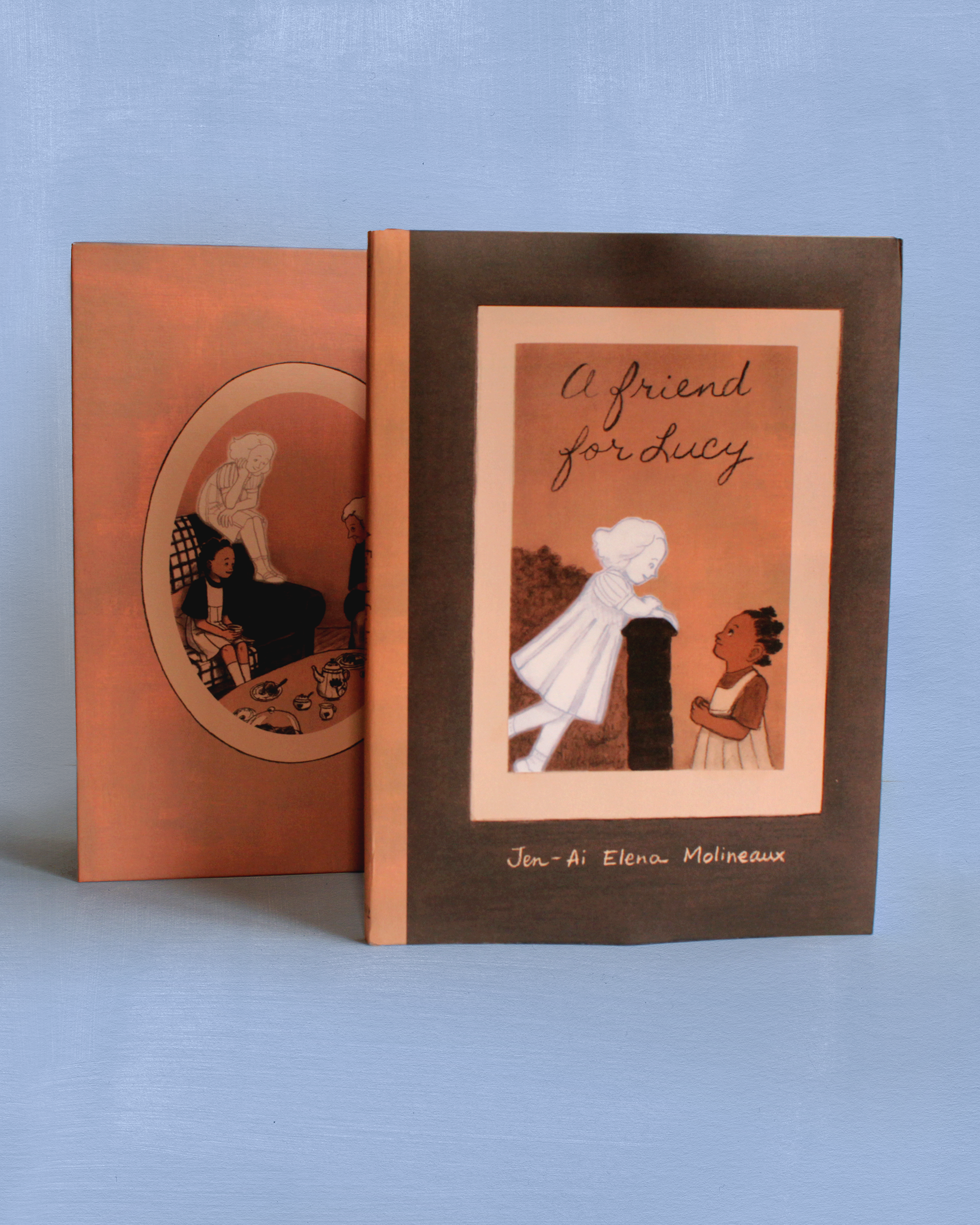 A friend for Lucy is a picture book illustrated in charcoal and digitally colored, with hand-written texts.