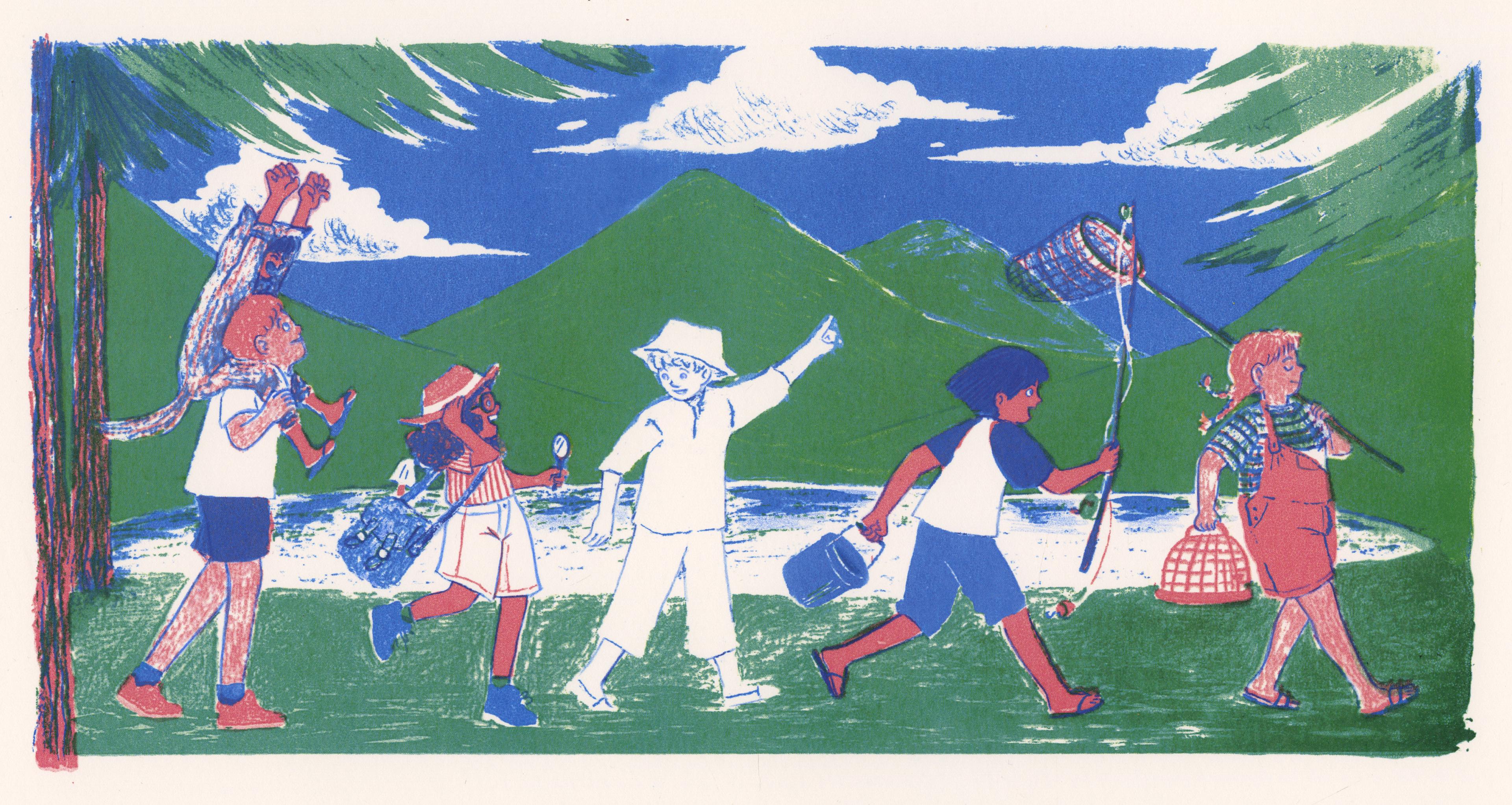 Set of five screen prints following a group of friendly ghosts.